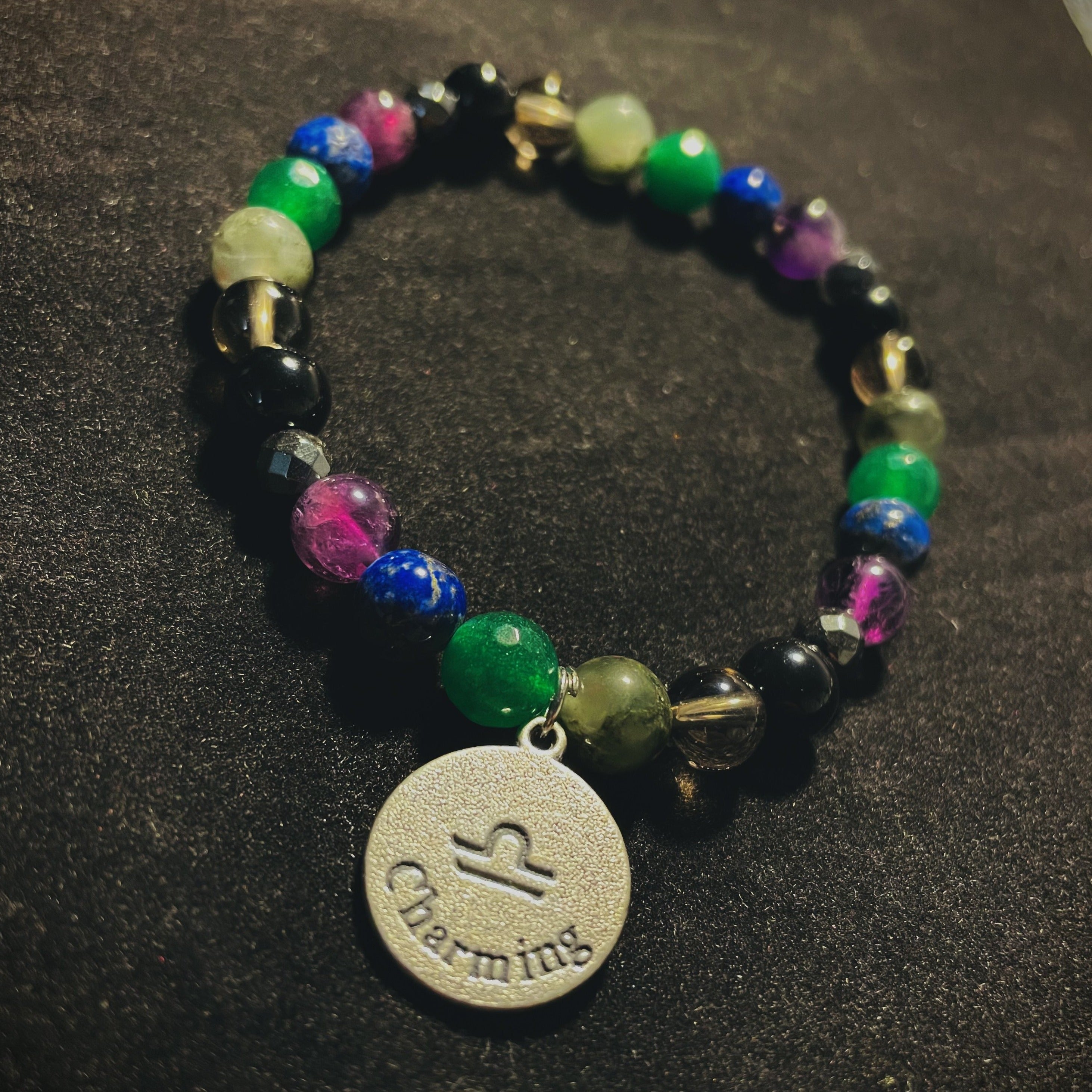 LIBRA NIGHT adorns green jade to enhance abundance & good fortune, lapis lazuli for wisdom & enlightenment, amethyst for sobriety, silver hematite for grounding & vitality, black tourmaline protection & clearing the aura, smoky quartz to also enhance stability & dissolving of negative energy, & bloodstone for detoxification & determination. Bold & beautiful 🌑